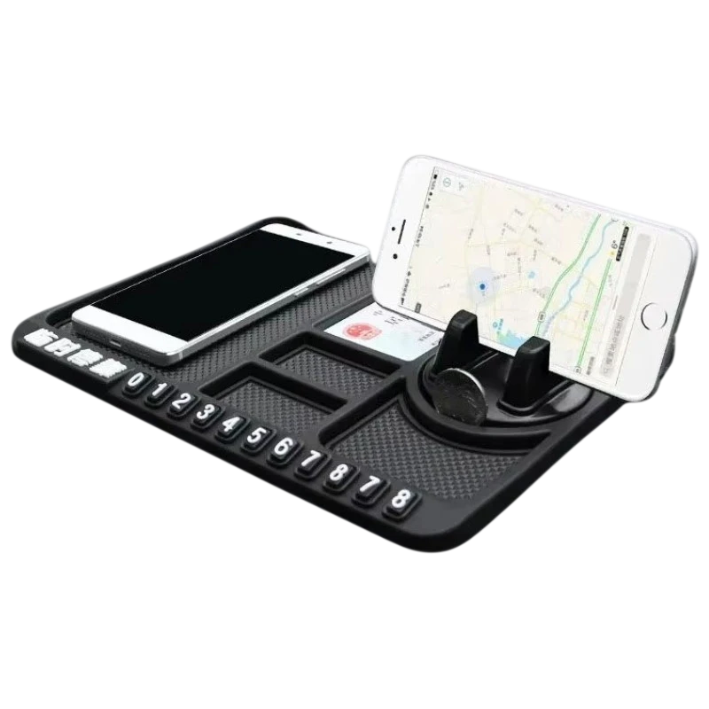 Permite tener todos los objetos de valor al alcance de la mano. Fabricado en material de silicona con superficie adherente dirigido a ubicarse en el salpicadero del coche, ideal para llaves, carteras, entre otros. Incluye un soporte giratorio de 360º para teléfonos o GPS, ofreciendo una correcta visualización de la pantalla.