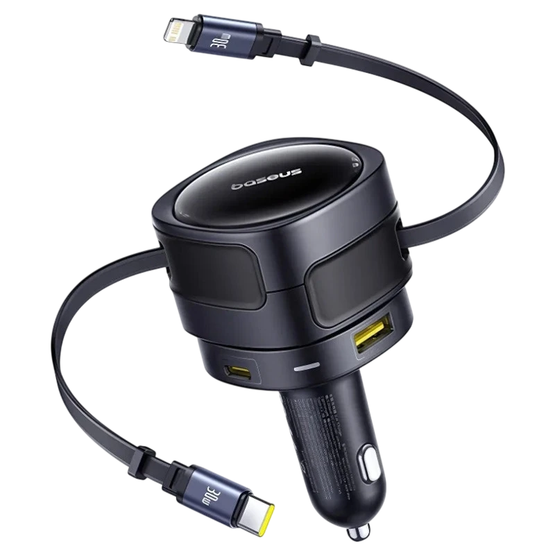 Este cargador de coche de Baseus permite cargar hasta cuatro dispositivos a la vez gracias a sus dos cables integrados (USB-C y Lightning) y dos puertos adicionales (USB-C y USB-A). Su potencia total de hasta 90W lo hace ideal para cargar smartphones, tablets e incluso portátiles durante tus trayectos.