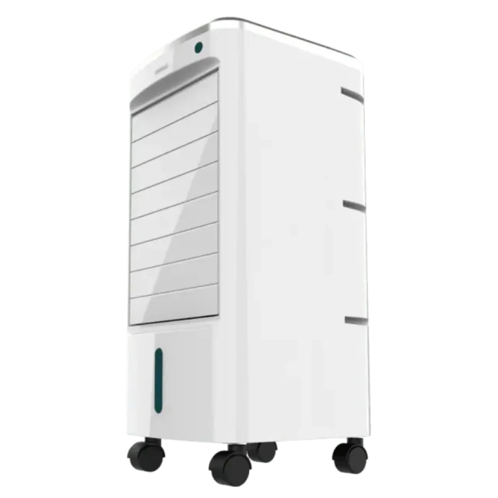 Sistema de climatización evaporativa que reduce la temperatura ambiente mediante el paso del aire por un panel de celulosa humedecido. A diferencia de los aires acondicionados convencionales, este equipo no utiliza gases refrigerantes ni requiere tubos de evacuación al exterior, lo que simplifica su puesta en marcha en cualquier estancia.
