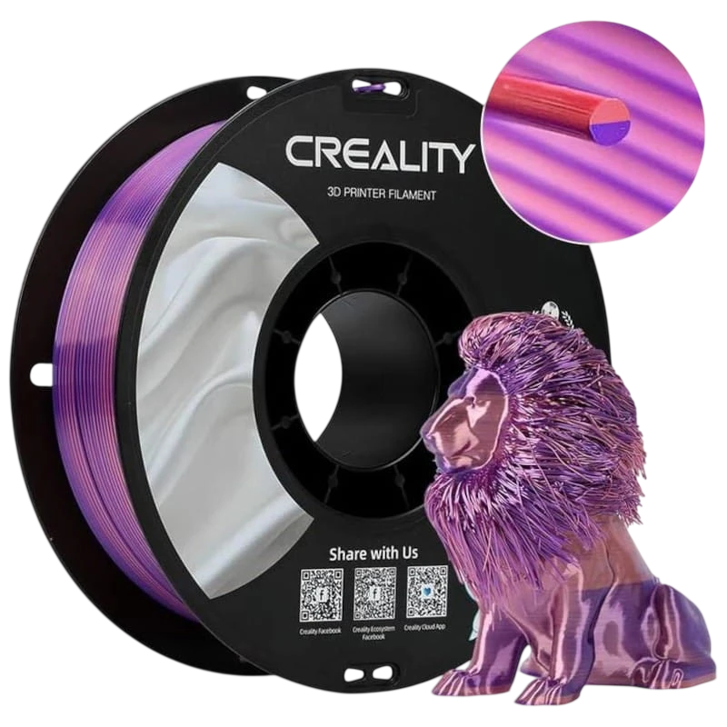 El filamento PLA CR-Silk de Creality en color dorado es de 1.75 mm (bobina de 1 kilogramo), que tiene una textura sedosa y brillante, además, posee resistencia mejorada y compatibilidad con una amplia variedad de impresoras 3D FDM, incluidas varias de la serie Ender y CR. Otra de sus características destacada es que garantiza extrusión precisa y superficie de impresión nacarada sin necesidad de pulido. Está disponible en color púrpura y rosa.