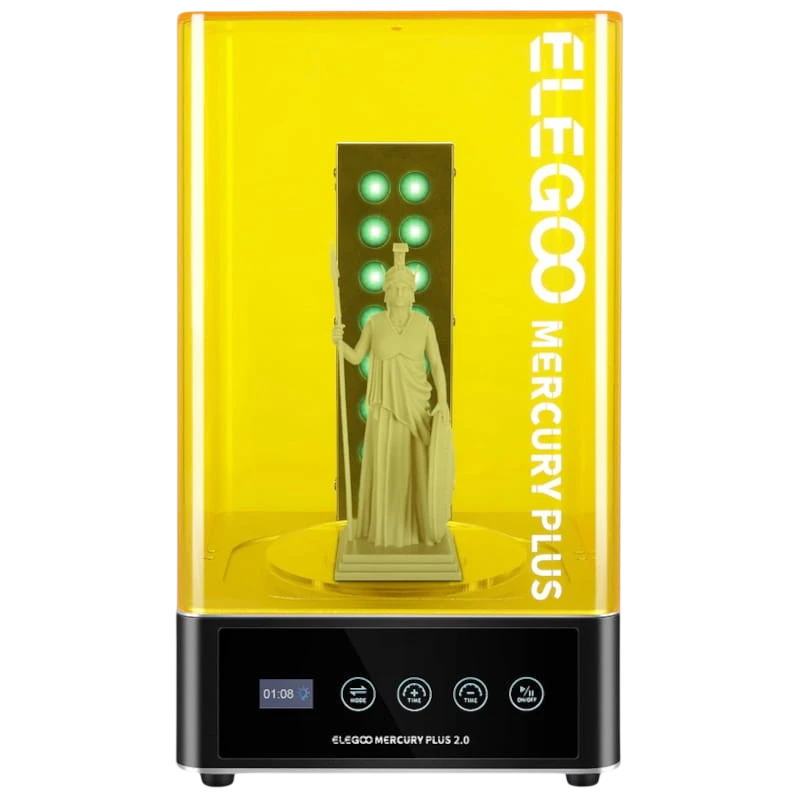 El dispositivo ELEGOO Mercury Plus 2.0 está equipado con 8 lámparas UV de 405 y 8 de 385 mm, acompañado de una placa giratoria de 360º, permitiendo que los modelos se curen de manera uniforme y completa. Además, es bastante silencioso porque cura sin necesidad de ventilador.