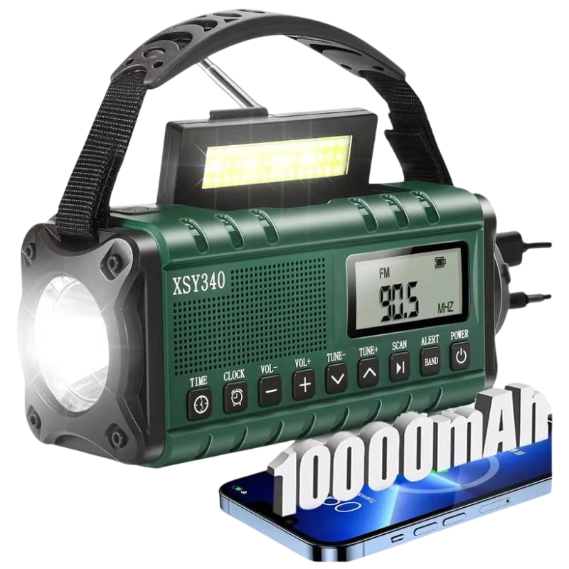 La batería integrada de 10 000 mAh permite mantener en funcionamiento la radio, la linterna y cargar dispositivos móviles en caso de necesidad. Se recarga mediante puerto USB, panel solar de 0,3 W o dinamo manual, garantizando energía incluso sin acceso a la red eléctrica.