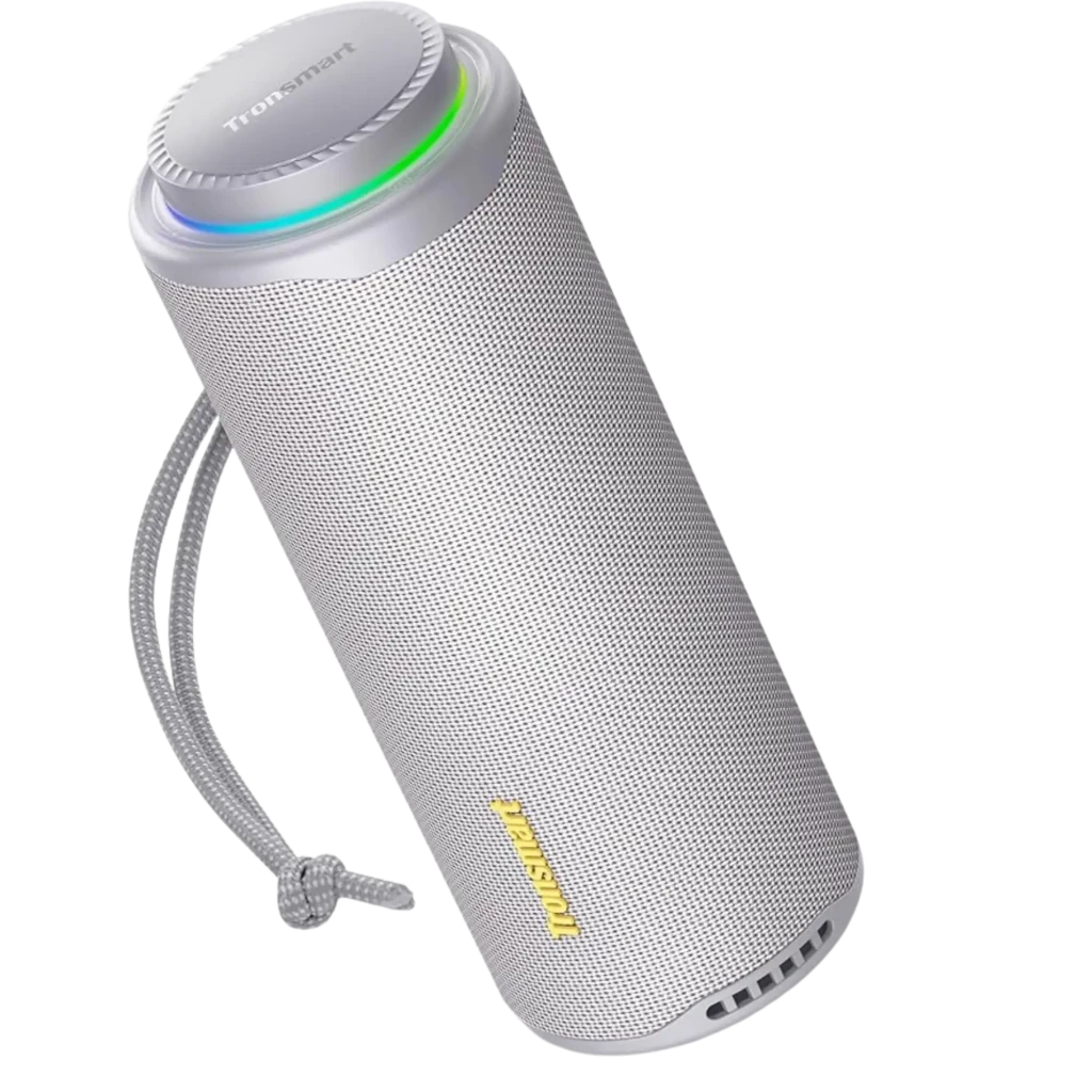 El chasis está construido con malla textil reforzada y extremos de goma para la absorción de impactos. Con certificación IPX7, el altavoz es impermeable y soporta inmersiones accidentales de hasta 1 metro de profundidad durante 30 minutos. El control es híbrido: un dial giratorio superior para el ajuste preciso del volumen y seis botones traseros para la navegación de pistas. A través de la aplicación oficial de Tronsmart se pueden gestionar los cinco modos de iluminación RGB, actualizar el firmware vía OTA y personalizar la ecualización.
