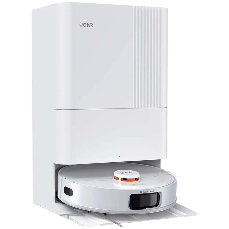 Le JONR P20 Pro est un aspirateur robot blanc avec une base intelligente multifonction qui permet des nettoyages quotidiens sans aucun entretien manuel. Il combine une puissance maximale de 8000 Pa, une brosse anti-enchevêtrement et deux serpillières rotatives avec un réservoir d'eau pour éliminer efficacement tout type de saleté. Il dispose également de la navigation LiDAR pour générer des cartes à 360º de la maison, planifier les itinéraires de nettoyage les plus appropriés et éviter les obstacles.