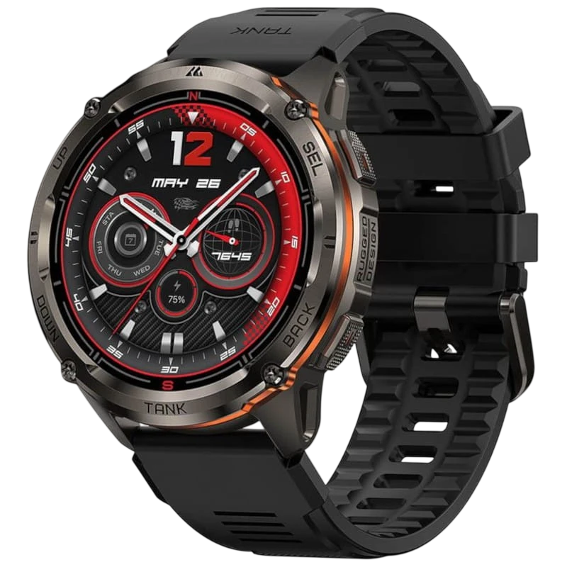 Kospet Tank T3 Ultra 2, une montre connectée sportive exceptionnellement résistante grâce à ses matériaux durables, notamment son boîtier et sa lunette en acier inoxydable, ainsi que ses boutons également conçus en acier. De plus, elle est adaptée pour la plongée grâce à sa résistance jusqu'à 50 mètres. Elle inclut de nombreux capteurs pour le sport et offre une autonomie prolongée. Disponible en couleur noire.
