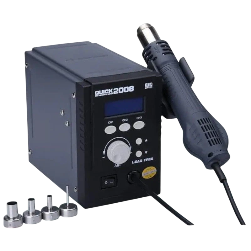 Le nouveau Quick 2008 est une station de chauffage à air chaud qui permet de souder des composants BGA, CHIP et autres matériaux. Il permet la soudure et le dessoudage de différents composants avec sa température réglable entre 100 et 500°C. Il est doté d'un écran LED et est assez sûr à utiliser.