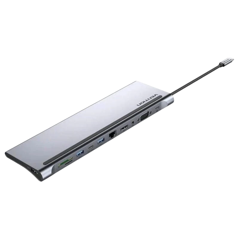 Ce nouveau Vention THTHC dispose de différents ports tels que son USB de Type C; son double port vidéo HDMI et VGA pour une utilisation avec des appareils tels que les téléviseurs ou les projecteurs; pour se connecter à un réseau Ethernet, il dispose d'un Gigabit Ethernet; 2 ports USB 3.0 haute vitesse et 1 port USB 2.0; une prise Jack 3,5 mm et un slot pour cartes SD.