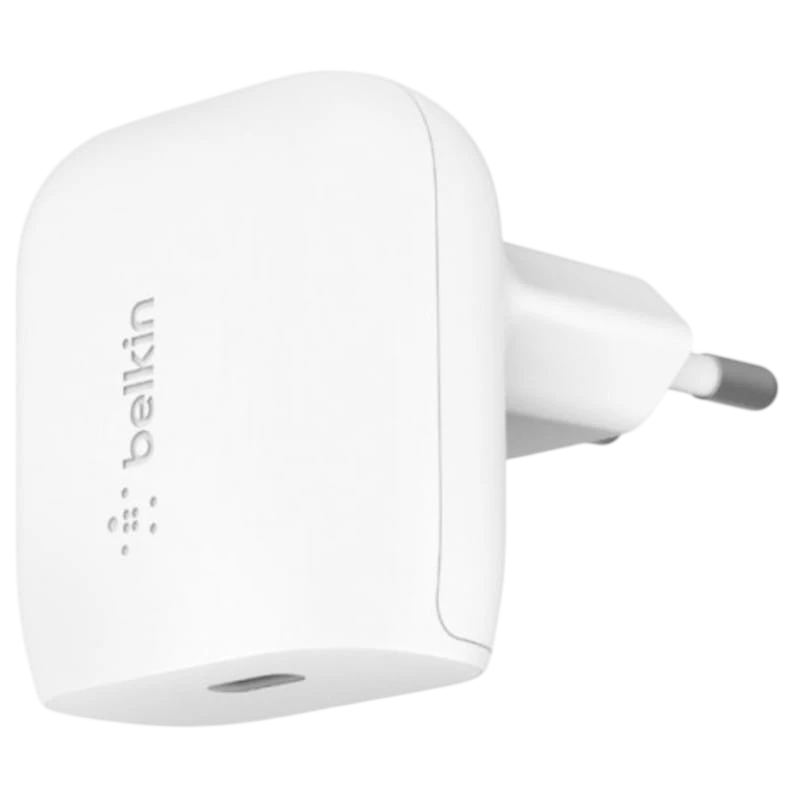 Carregador de parede USB-C de 20 W da Belkin com o protocolo de carregamento rápido USB-Power Delivery. Carregue dispositivos habilitados para USB-PD de 0 a 50% em cerca de 30 minutos.