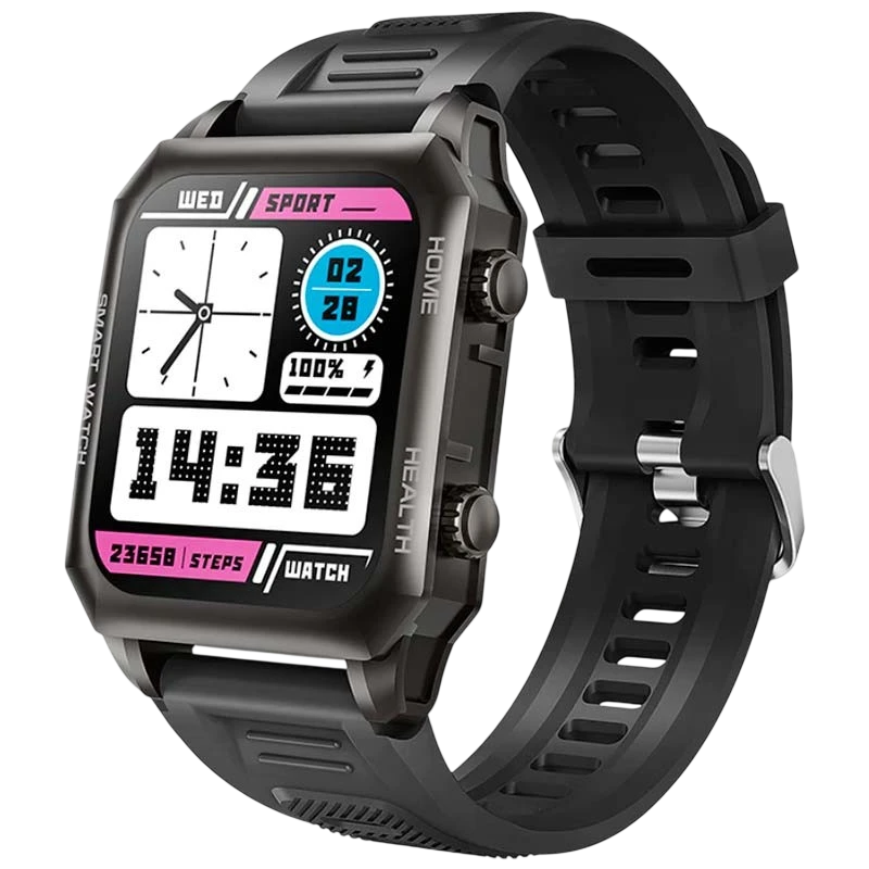 Ecrã sensível ao toque TFT - Design retangular de 1,69 - Resolução de 240 x 280 p - Monitor de frequência cardíaca 24 horas por dia, 7 dias por semana - Monitor de SpO2 - Gravação do sono - Vários modos esportivos - IP67 resistente a poeira e água - Bateria de 280 mAh - Preto