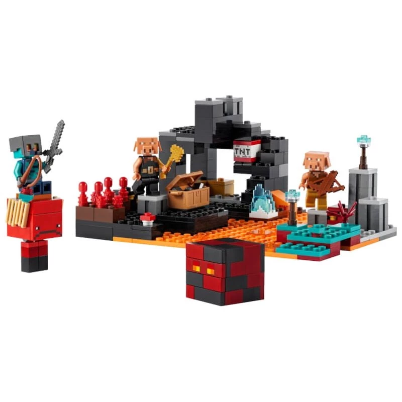 O LEGO Minecraft O Bastião do Nether é um conjunto com o qual os jogadores vão ter acesso ao ardente Nether Bastion para superar desafios para obter itens. Este conjunto tem 300 peças e inclui personagens do Minecraft (um Nether Adventurer, um Magma Cube, um Brute Piglin, um Piglin e um Lavagant), itens especiais (como uma função de explosão ;n que é ativada por inserindo TNT e pressionando uma alavanca) e acessórios que as crianças reconhecerão do jogo.