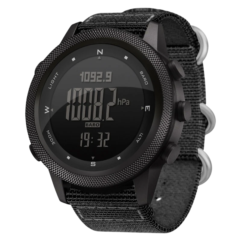 Altímetro, barómetro e bússola digitais são combinados com uma bateria CR2032 com duração de 8 a 10 meses e uma estanqueidade de 50 m numa caixa de aço de 46 mm. O vidro temperado e o ecrã FSTN com retroiluminação EL garantem visibilidade e resistência em expedições prolongadas.