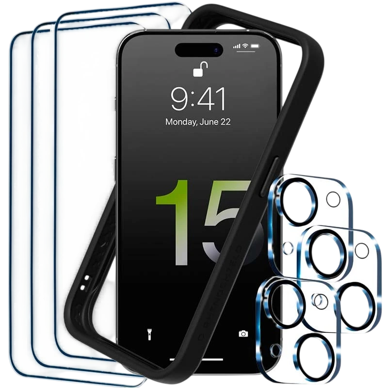 Apresenta-se o pacote de acessórios definitivo para iPhone 15. Este inclui: três protetores de ecrã, três protetores de lentes e uma capa Bumper.