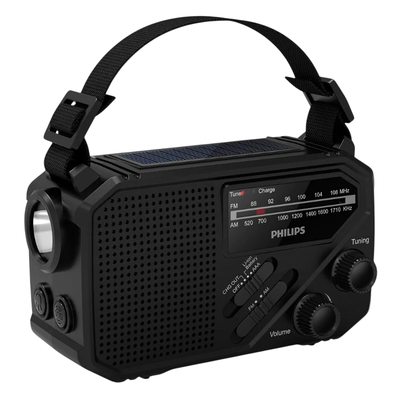 Face à Sony ICF-B99 (60–90 mW, 385 g), a Philips oferece quase o dobro da potência de áudio e acrescenta conector USB-C, embora a Sony inclua bússola e apito. Em comparação com a Eton FRX3+ (2600 mAh, NOAA), a TAR1609/00 é cerca de 35% mais leve e mais acessível, embora não disponha de banda meteorológica. Relativamente à antiga Philips TAR1506, aumenta a potência de 0,1 W para 1 W e acrescenta lanterna e carregamento solar. Os seus pontos a melhorar são a ausência de Bluetooth e a potência limitada para grandes grupos, mas para campismo, kits de emergência ou trabalhos ao ar livre oferece um equilíbrio convincente entre funcionalidades, autonomia e portabilidade.
