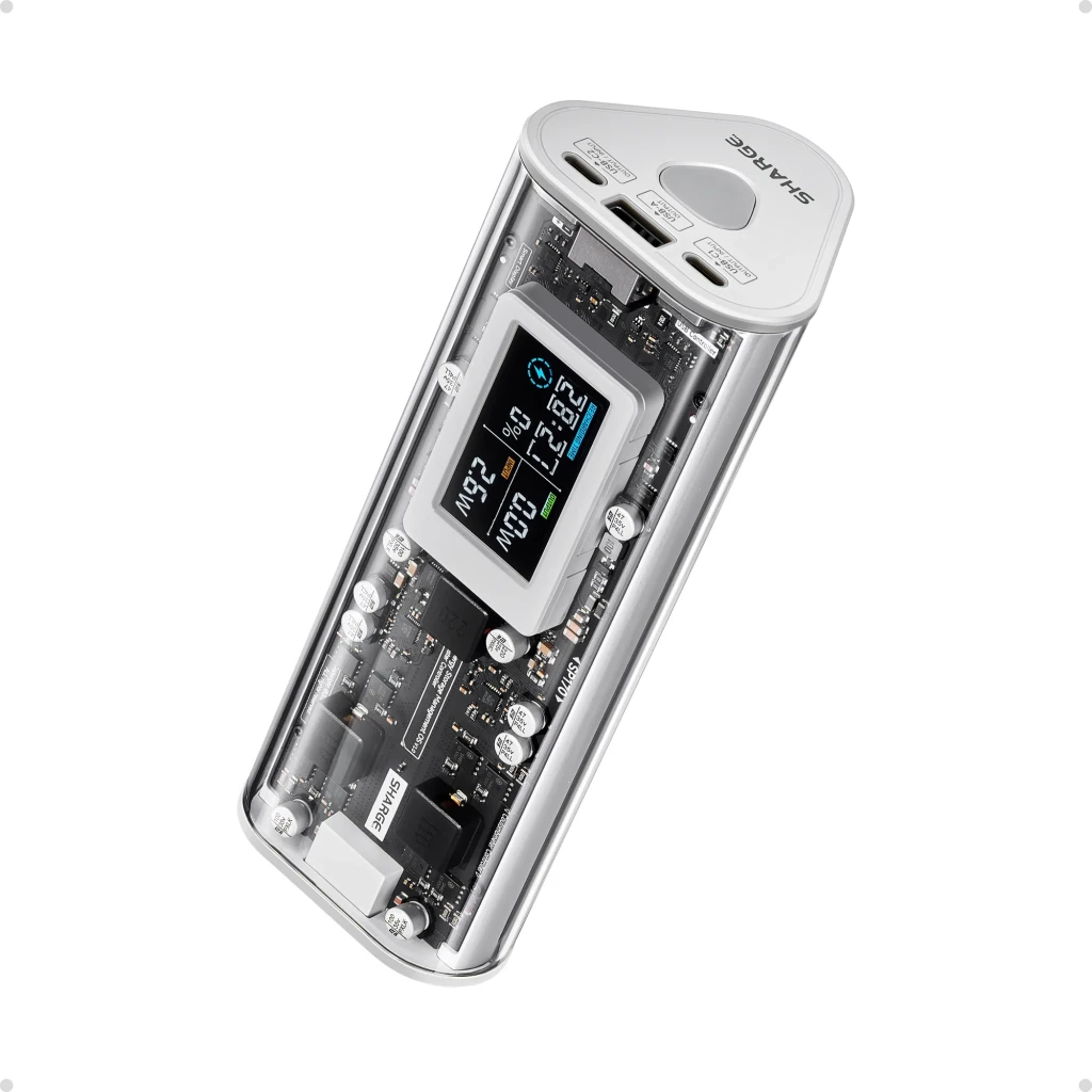 O chassis de prisma triangular transparente inclui um ecrã LCD IPS Smart Display. Este painel apresenta em tempo real a voltagem, amperagem e potência (W) de cada porta, além de uma estimativa do tempo restante de carga ou descarga consoante o consumo atual.